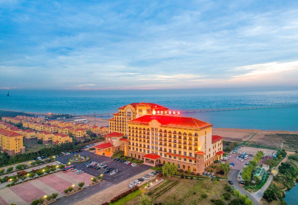 本店位于海阳市旅游度假区内万米金沙滩上,海滨中路187号,,周边配套极为丰富:市政府、湿地公园、连理岛、地雷战纪念馆、万米金沙滩、沙雕艺术公园、海水浴场、大型购物广场、海立方水上乐园等。这里集行政、商业、娱乐于一体,独特的地理位置,周边紧邻沙滩与大海,在沙滩泳池、金沙乐园游乐场畅游嬉戏,音乐广场上烧烤与海风相伴点燃盛夏的激情与自由。酒店自2012年成功接待第三届亚洲沙滩运动会后,目前作为海阳高标准的接待酒店和涉外酒店,无论您是商旅办公还是度假休闲,是携子出游还是娱乐养生,都能充分享受到满意的服务与碧海相融的自然景色。