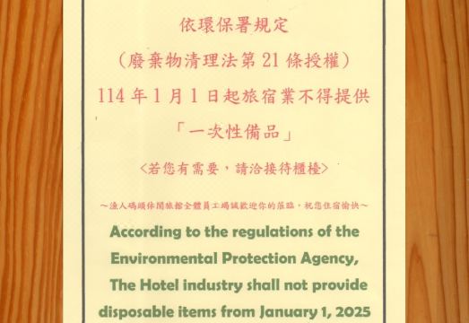 依环保署规定(废弃物清理法第21条授权)2025年1月1日起旅宿业不得提供一次性备品。若您有需要,请洽接待柜枱。