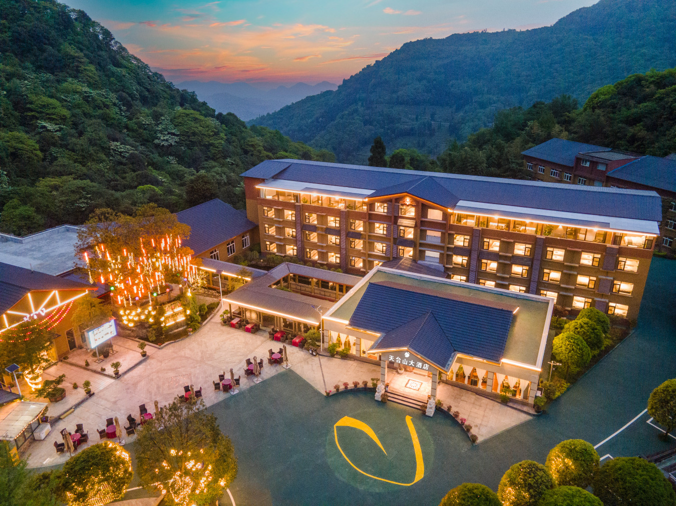 邛崃天台山大酒店位于风景名胜区——天台山风景区内,是成都周边地区著名的旅游避暑度假胜地。 酒店占建筑面积14000平方米,有客房,餐厅,室内室外KTV,户外特色烧烤,棋牌茶室,大中小会议室,家庭影院,以及篮球场,羽毛球场,拔河比赛区域,儿童活动区域。 酒店拥有各式客房百余间,有可容纳300余人的大型餐厅,以天台山山珍、野味、野菜、老腊肉为特色,和以鸡鸭兔、全羊为特色的容纳300人的大型户外烧烤;还有可容纳30人,70人的室内KTV和拥有6平方米LED屏幕的可容纳300人的户外大型KTV。 同时酒店包含多个包间,卡座,机麻的室内室外茶楼棋牌室。大中小型会议室分别可容纳280人,70人,20人。影音效果超棒的可同时容纳15人的家庭影院。 除此之外,这里还有儿童游乐区、篮球场、羽毛球场、拔河比赛区以及象棋围棋户外休闲活动。