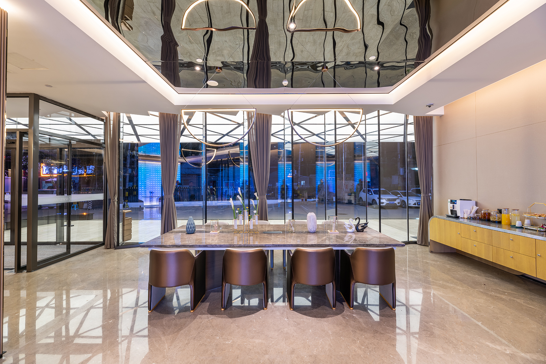 桔子水晶酒店(北京南站木樨園店)位于北京市豐臺區東羅園,酒店位于木樨園橋東側,臨近地鐵8號線木樨園站(C出口),臨近北京南站、北京站、大興國際機場;緊鄰天壇公園、陶然亭公園、龍潭西湖公園、北京京劇院、中國評劇藝術中心、自然博物館、前門、故宮天安門;周邊有百榮商貿城、合生廣場、方仕國際黃金珠寶城、福海國際大廈、北京大紅門等購物中心、銀行等生活購物一應俱全;桔子水晶酒店屬于設計師酒店,秉承一店一設計,酒店客房屬科技引領未來的設計理念,房間配備小度音響、55寸液晶電視、電動窗簾等;客房隔音系統由清華學所設計保證安靜睡眠。木樨園, 即“桂花之園”木樨,桂花也。此次設計概念試圖以風吹花紛飛的畫面,來營造花香四溢的視覺體驗,并利用桂花 不同形色種類來呈現空間里的色彩變化,意圖打造一個帶有桂花氣質高貴、優雅的大堂空間。酒店大堂利用靜態的幾何造型,模擬桂花飄落的動態瞬 間,加上車邊鏡相互呼應反射的效果,來展現 水晶酒店高雅、不失趣味的個性.