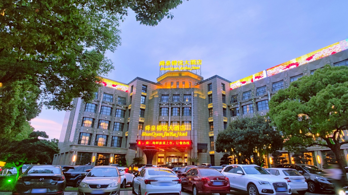 舜泉锦悦大酒店——定位为高品质综合性酒店,位于上虞区舜江西路108号,建筑面积15000余平米,舜泉锦悦大酒店地处曹娥庙旅游文化区,座落绍兴上虞区南大门首席。锦悦店拥有尊贵典雅、奢华大气的新古典风格餐饮包厢43间,及满足不同需求的,可容纳50席的舜泉厅、26席锦悦厅和17席锦尚厅的3个大型宴会厅;并配备奢华典雅,宽敞私密的豪华客房。客房宽敞体贴、空间私密,奢华典雅,为尊贵的您提供一系列独享的优惠和个性化专业管家服务,定能伴您度过温馨之夜。可同时容纳1500余人就餐,被评为中华餐饮名店,国家白金五钻级酒店及2019年度中国餐饮五百强门店第44强。酒店方圆一公里方位内,拥有曹娥庙、舜帝岭、中华孝德园等江南着名旅游景点,繁华的舜杰路商业街可供购物、休闲,以及一江两岸滨江商业圈;方圆三公里范围更有多家大型购物商圈,万悦城、万和城、大通商城、万达广场等,酒店环境优越,交通便捷分别连接上虞老城区、城西、城北、万达等多个繁华商业区,公交直达上虞高铁北站以及萧山国际机场机场大巴,出行十分便捷,同时酒店全体员工更能为每一位宾客提供温馨、体贴的周到服务。