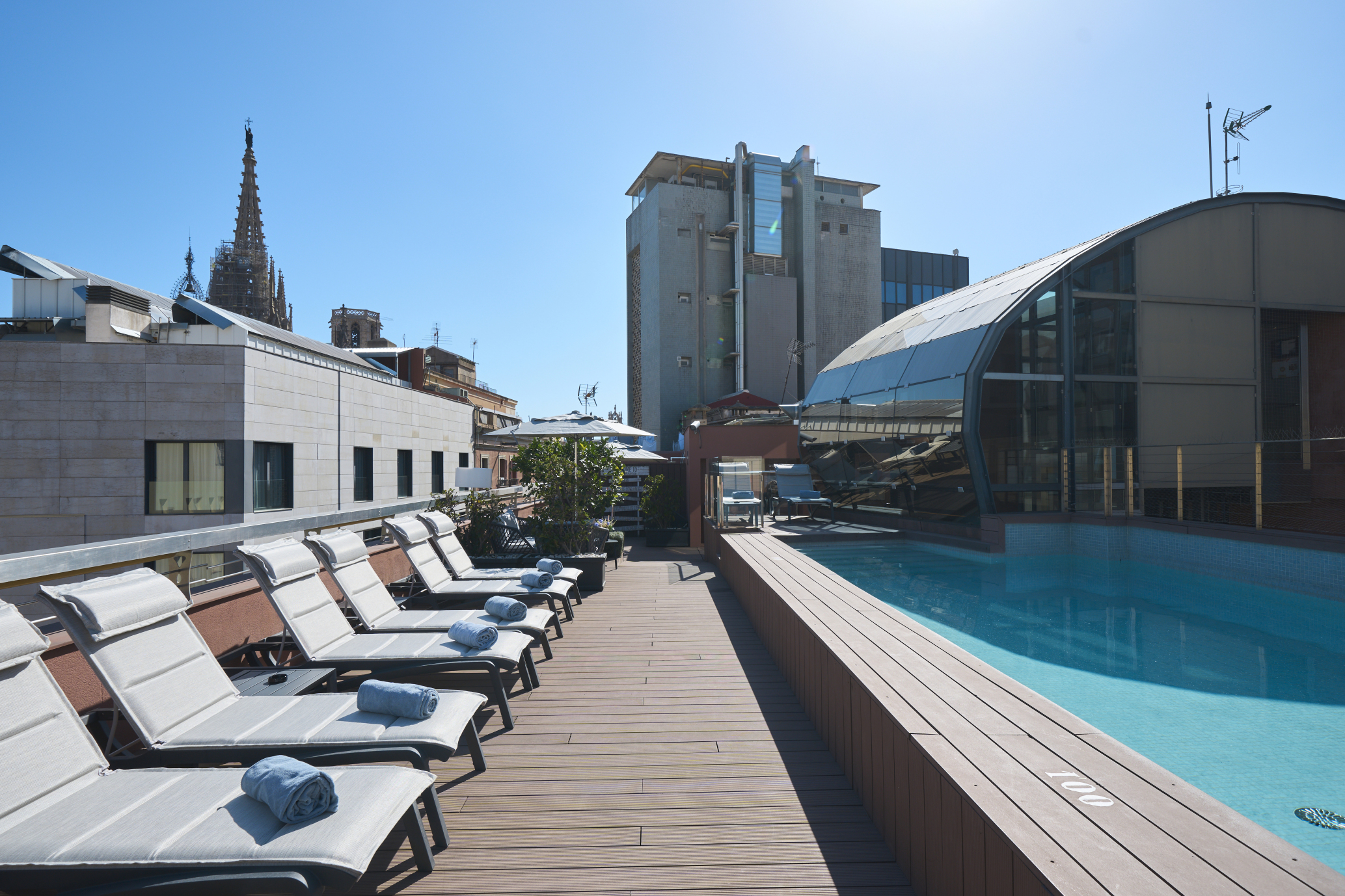 With a stay at Catalonia Catedral Hotel, you'll be centrally located in Barcelona, steps from Barcelona Cathedral and within a 5-minute walk of La Rambla. This eco-certified hotel is 2 mi (3.2 km) from Plaça de Catalunya.Enjoy recreation amenities such as an outdoor pool or take in the view from a terrace. Additional features at this hotel include complimentary wireless internet access, concierge services, and a reception hall.Enjoy Mediterranean cuisine at Ascent, a restaurant which features a bar/lounge, or stay in and take advantage of the room service (during limited hours). Quench your thirst with your favorite drink at the poolside bar. Buffet breakfasts are available daily from 7:30 AM to 11 AM for a fee.Featured amenities include a computer station, complimentary newspapers in the lobby, and dry cleaning/laundry services.Make yourself at home in one of the 71 guestrooms featuring minibars and flat-screen televisions. Complimentary wireless internet access keeps you connected, and satellite programming is available for your entertainment. Private bathrooms have complimentary toiletries and hair dryers. Conveniences include laptop-compatible safes and desks, and housekeeping is provided daily.