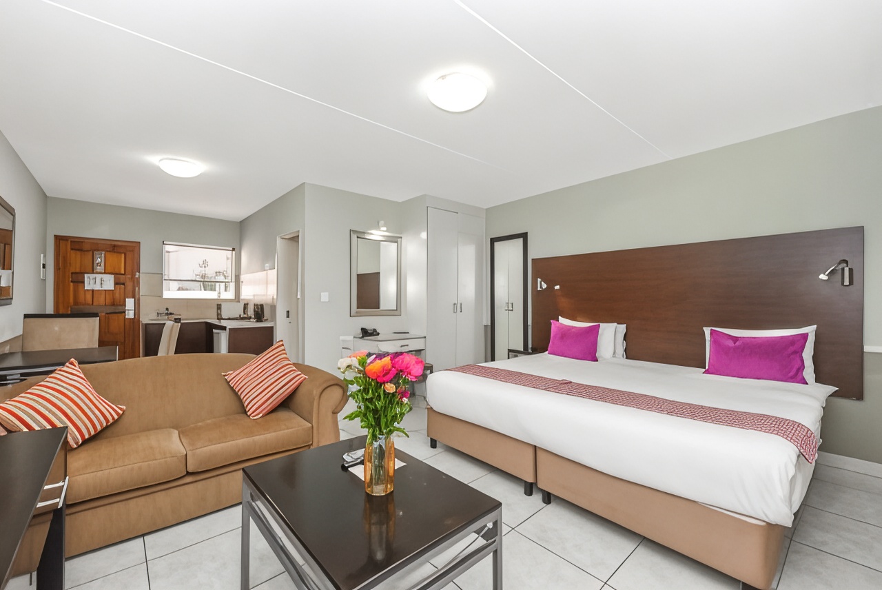 The Mercure Nelspruit Hotel is situated on the edge of the Kruger National Park. The hotel offers 102 spacious and comfortable suites with modern amenities and access to wi-fi. The suites come with a kitchenette, living room, bathroom with shower and bath tub. For professionals, the hotel has 5 meeting rooms for professional events or conference. Enjoy a relaxing time next to our swimming pool with a cocktail from the bar. The restaurant offers all-you-can-eat breakfast buffet and South African cuisine.