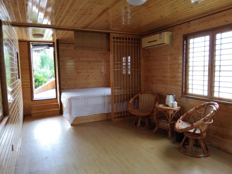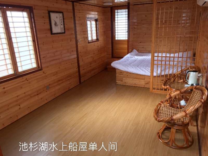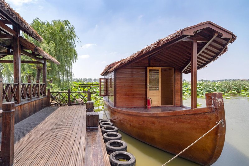 船屋设在池杉湖国家湿地公园内,临水而建,木质结构。自然纯朴,周围湿地风光,赏池杉魅影、观林鸟依依,身居其中,会有与自然交融、与天地对话的旷意之感。