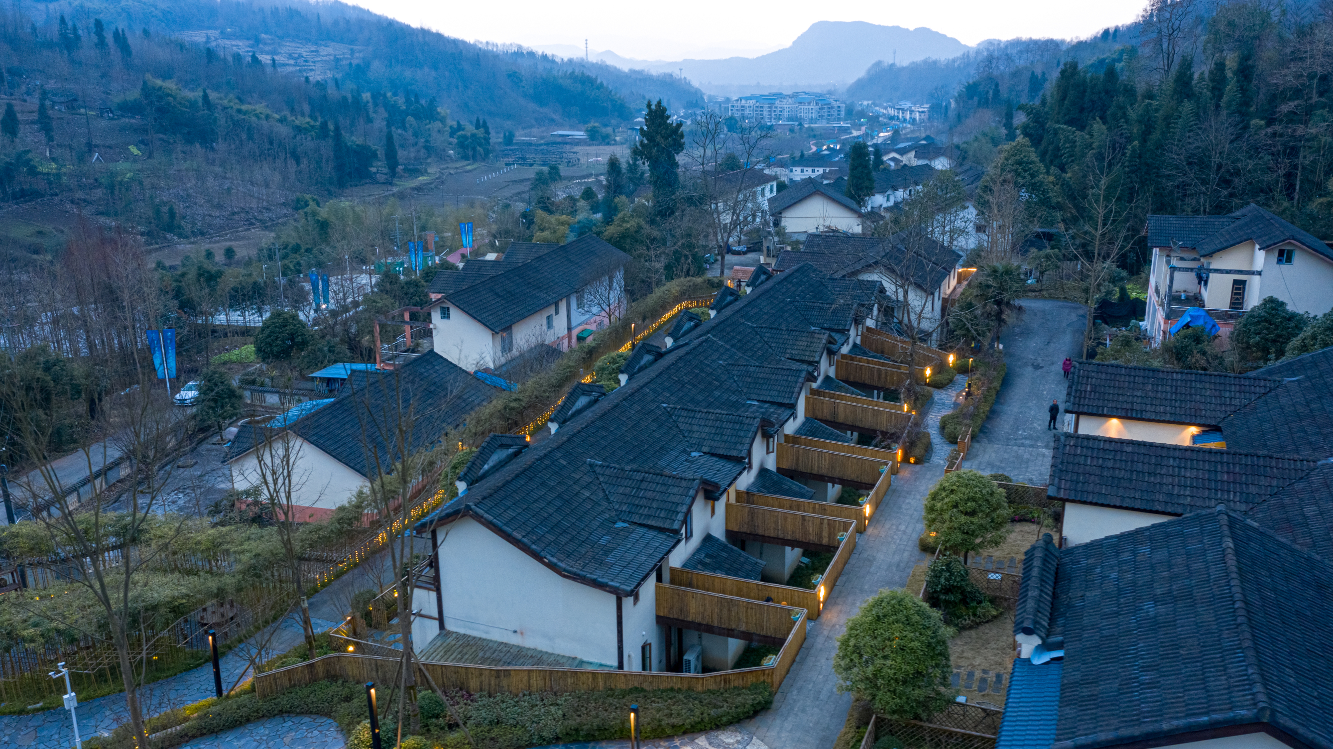 安亦悦舍温泉别墅位于彭州市通济镇花溪村,毗邻彭州宝山国家AAAA级旅游景区,海窝子古镇,丹景山旅游风景区,法式白鹿小镇,背抵龙门山脉,依傍湔江流域,得天独厚的自然资源和气候条件,年均温仅15.7℃。距离成都约76公里,车程一个半小时。安逸悦舍温泉别墅依山(龙门山脉)傍水(湔江支流花溪)而建,夏天在花溪踩水,冬天龙门山赏雪、酒店私汤,户外泡温泉。园区共有12栋别墅;其中包括综合别墅1栋设置有接待前台,茶酒肆大堂吧,禅意茶室,餐厅,放映室,会议室,棋牌娱乐室;