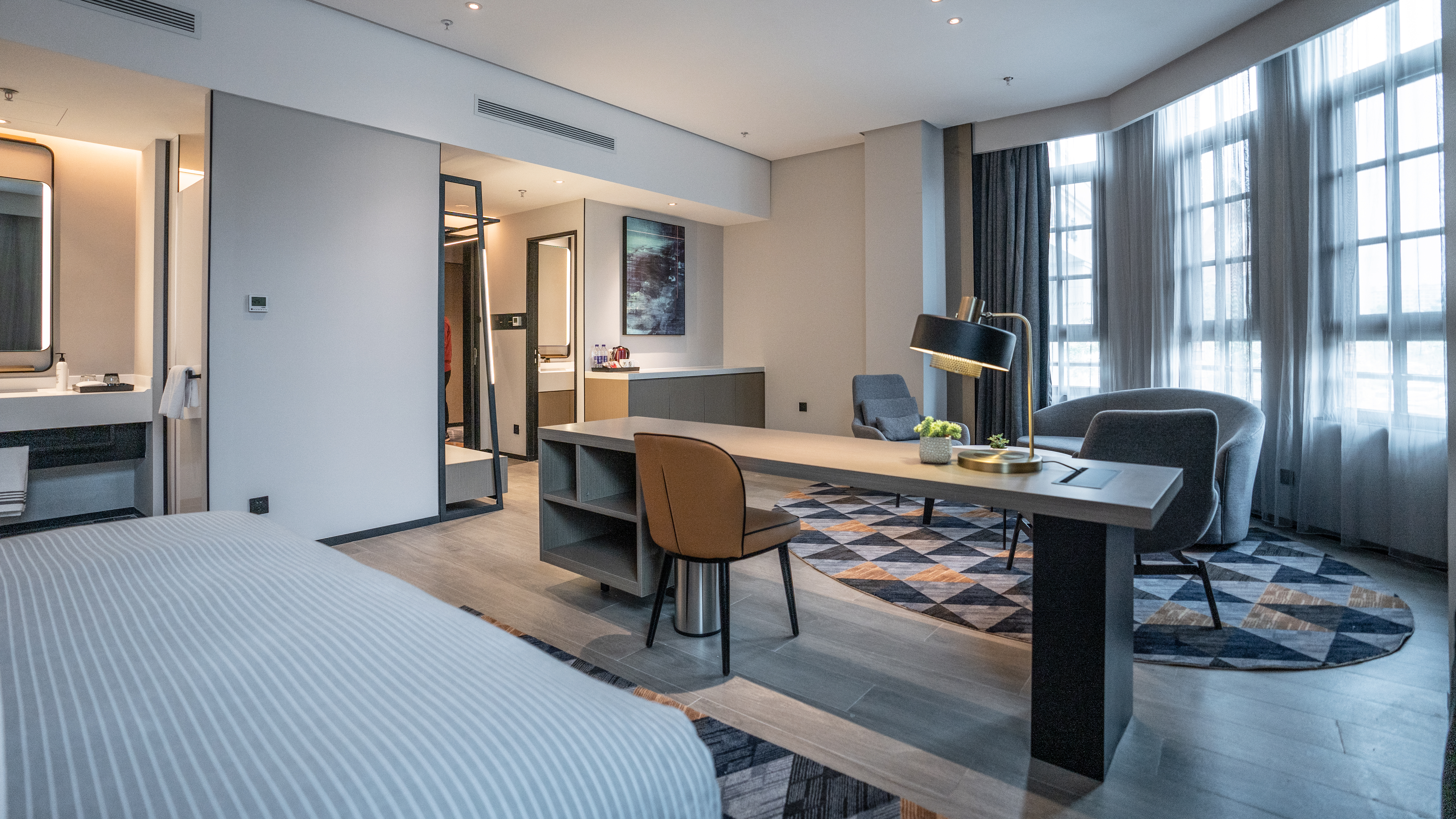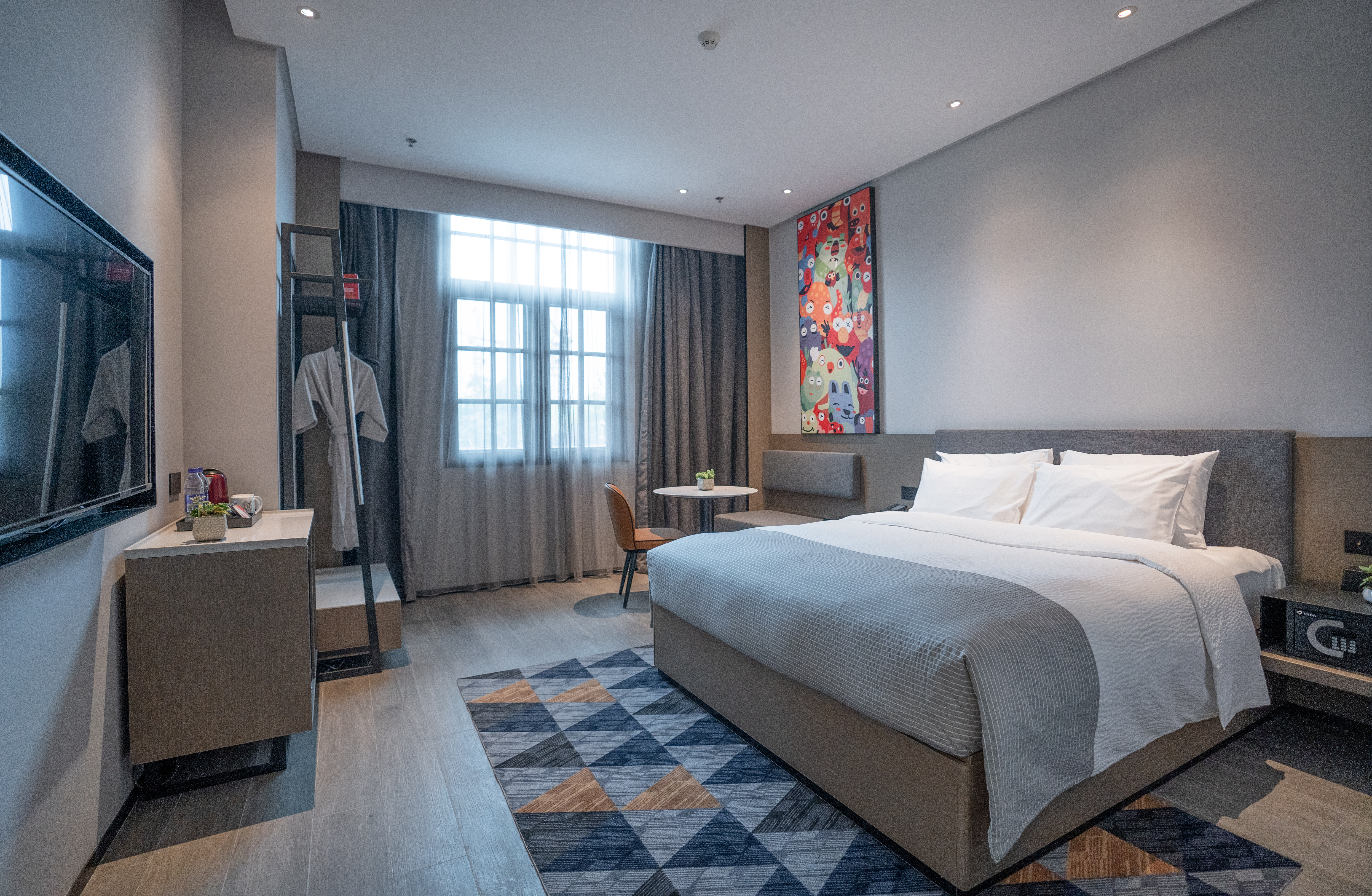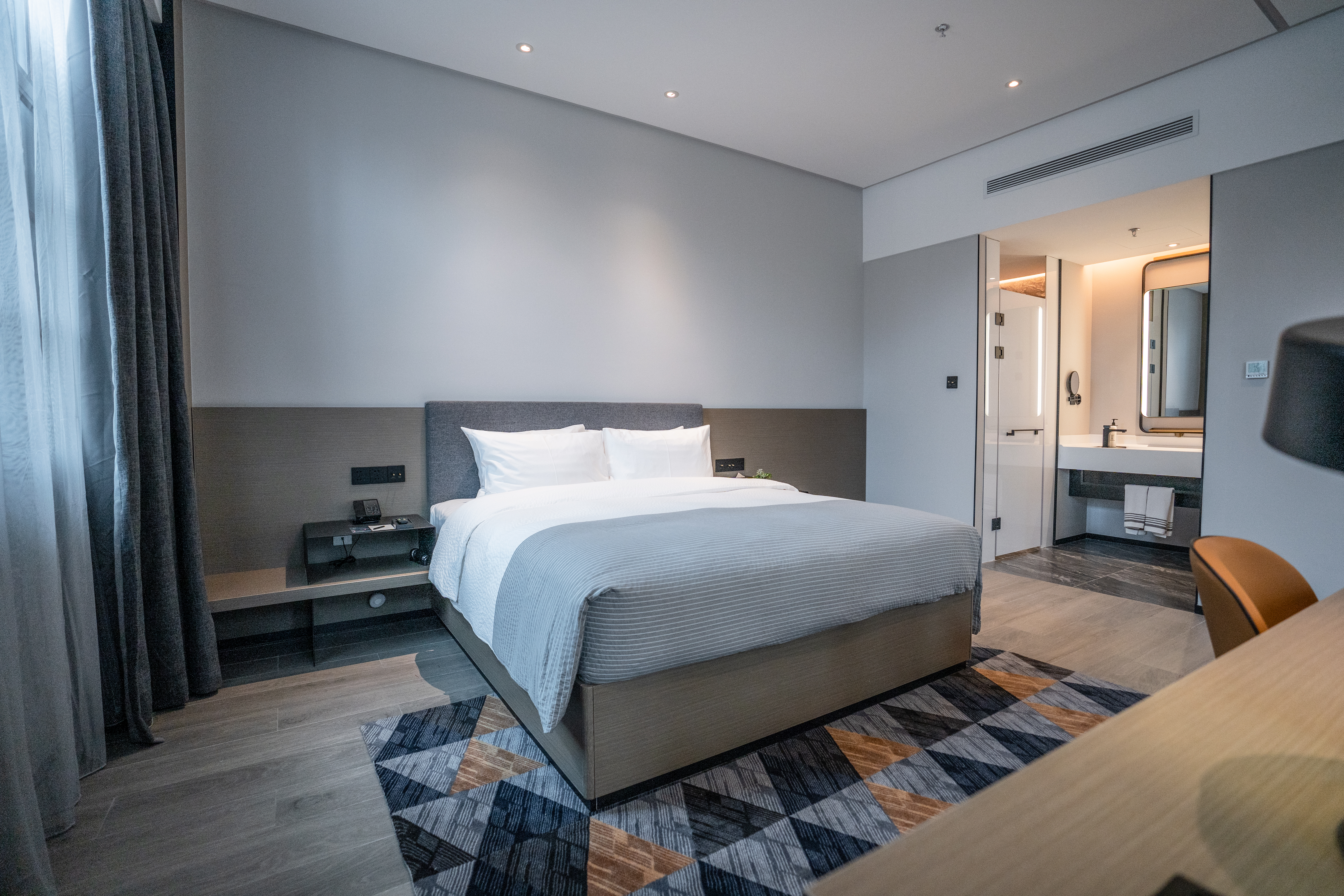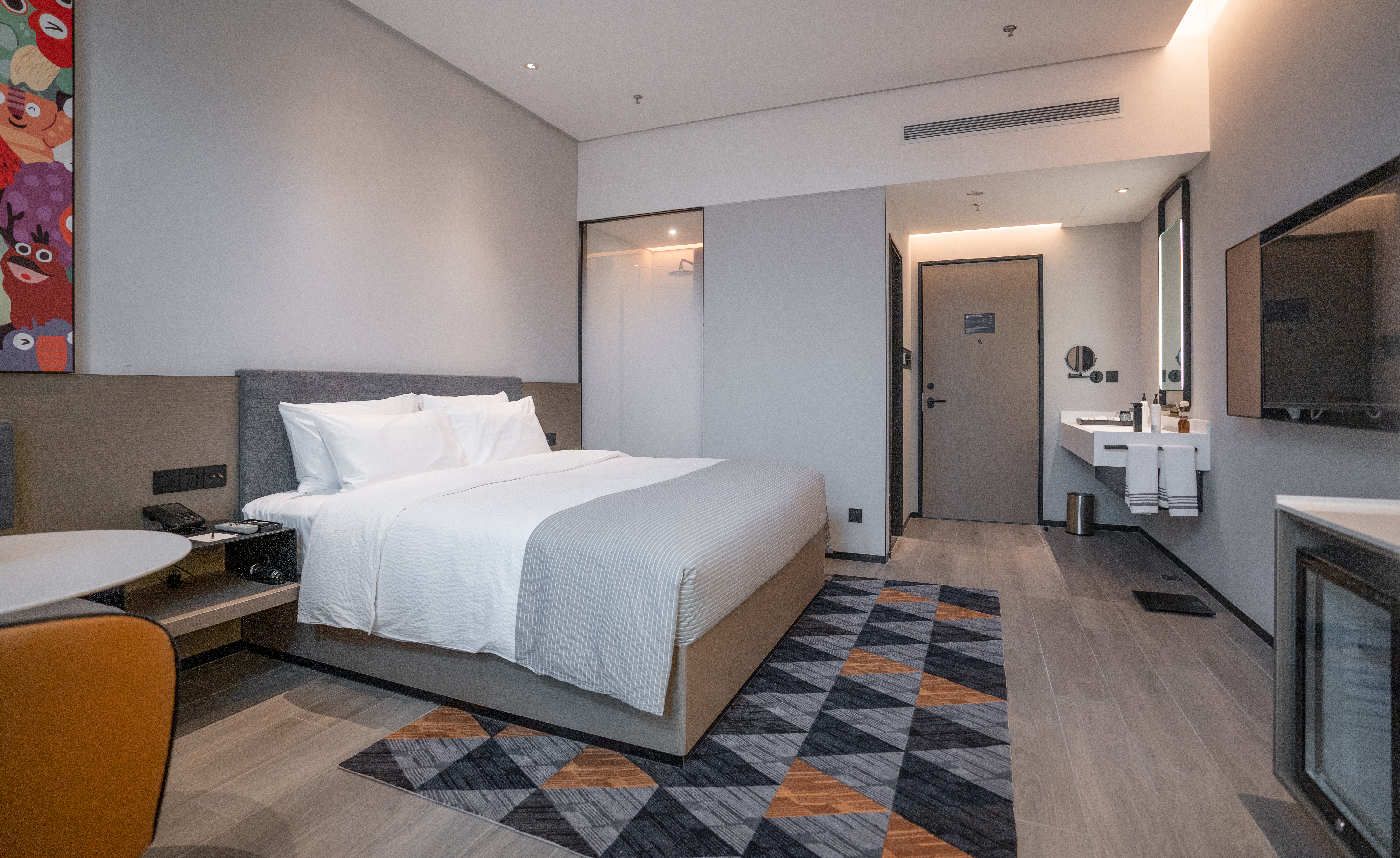 The hotel's guest rooms are equipped with high-quality and eco-friendly bath products. All the comfortable super-large beds are from globally renowned bedding brands. Each room is furnished with a 50-inch high-definition LCD TV, offering a smooth experience of one-click switching between phone and TV screen projection. The bathrooms are equipped with rainforest shower systems, smart toilets, and separate dry and wet areas. High-quality down and skin-friendly bedding provide guests with an upgraded stay experience.