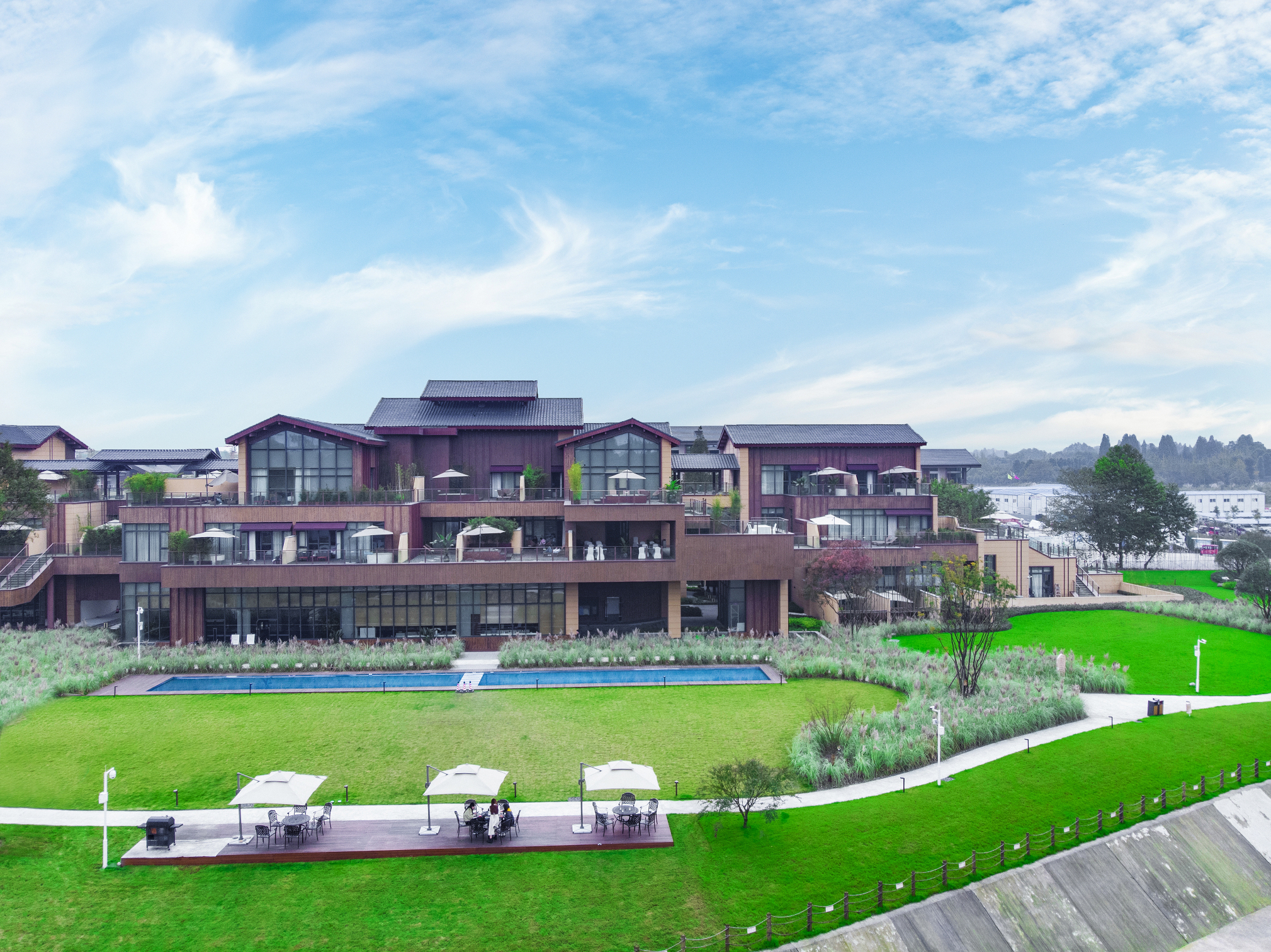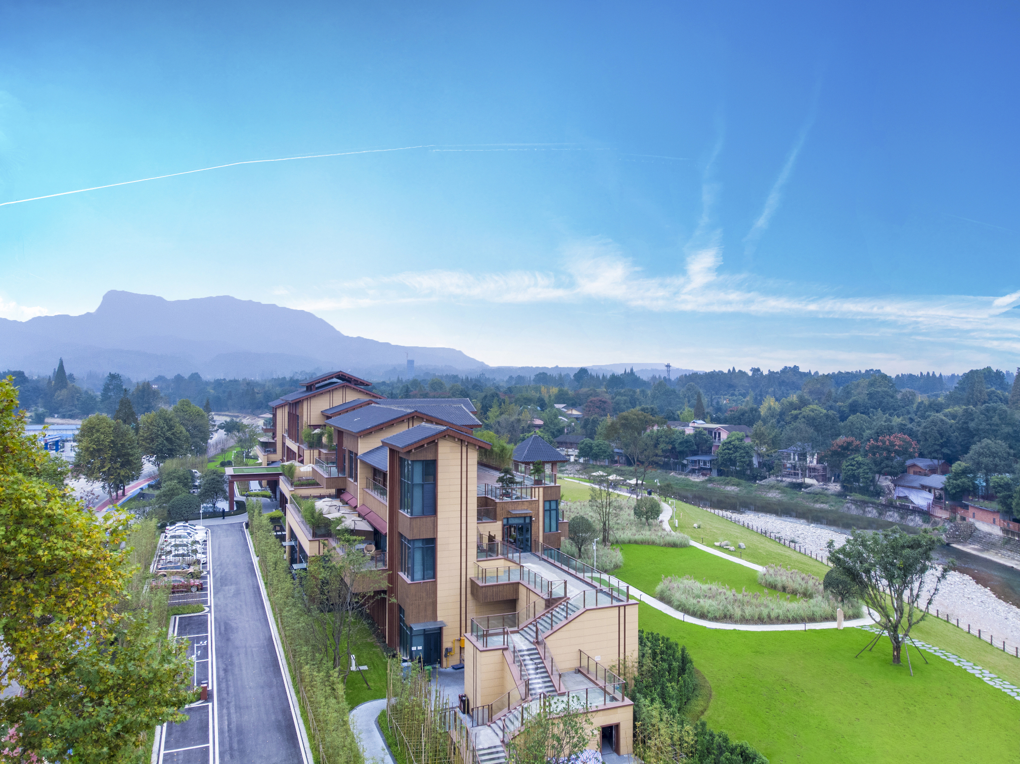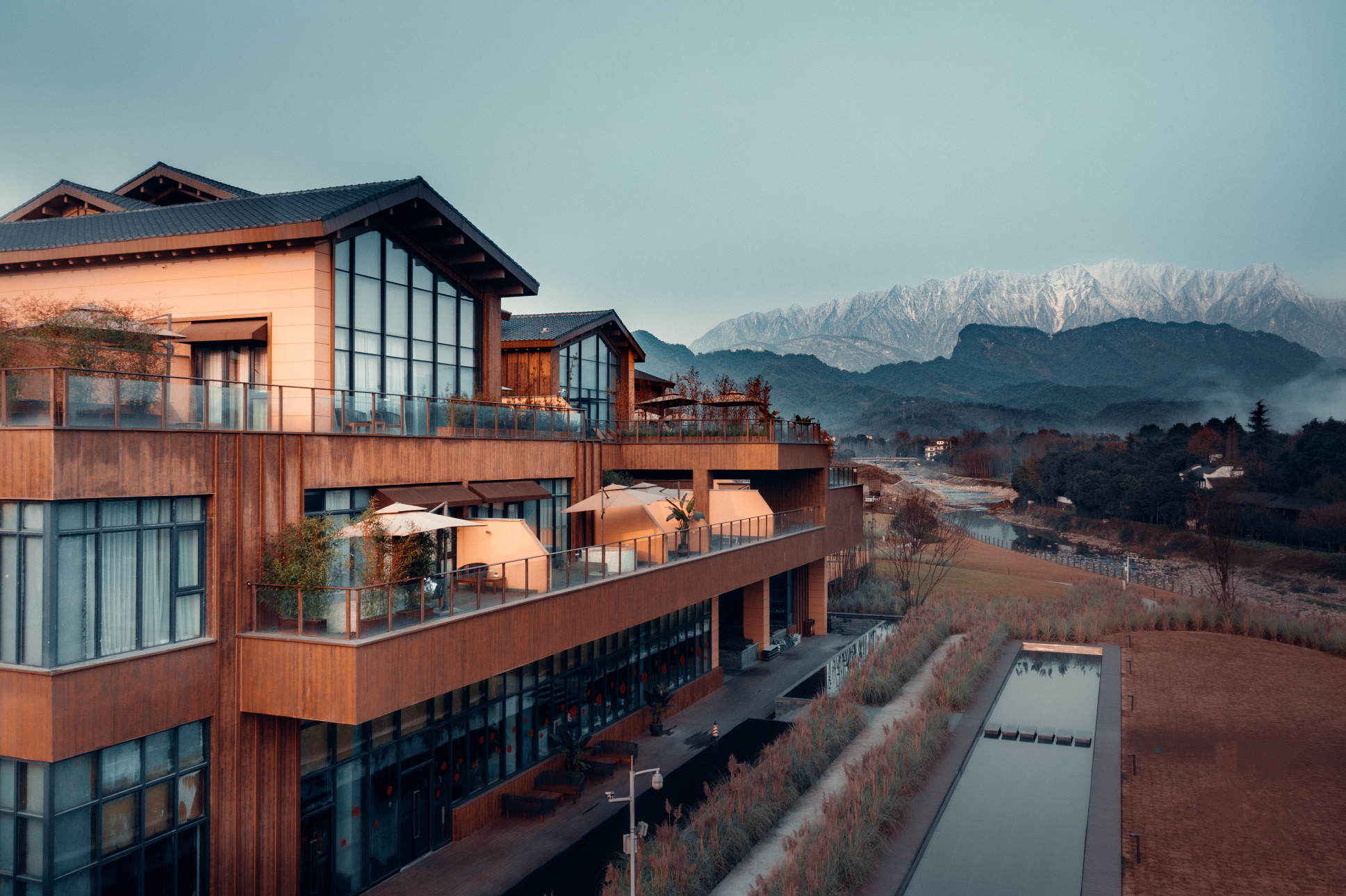 青城山春山外精品汤屋度假酒店整体建筑风格为后现代中式风格,通过简洁、自由的表达方式,让整个建筑与自然和谐相处,不破坏,不打扰青城山原有的那份秀美。将项目打造成区域颜值担当,现代川西地域符号。”千年道文化浸氲其间,设计以艺术和人文为主调,新中式的建筑风格、禅意的气氛格调。周边景点丰富毗邻青城山-都江堰、四川大熊猫栖息地、都江堰水利工程三大世界遗产。往返周边热门旅游风景区十分便利,近高铁青城山站,位置优越,交通便捷。“坐望老君阁,消暑王婆岩,戏水石孟江”。青城山春山外精品汤屋度假酒店特设有:户外小火锅,江畔BBQ,让您涮出不一样的川辣,烤出不一样的新意。观山水之景,食“春山”百味。