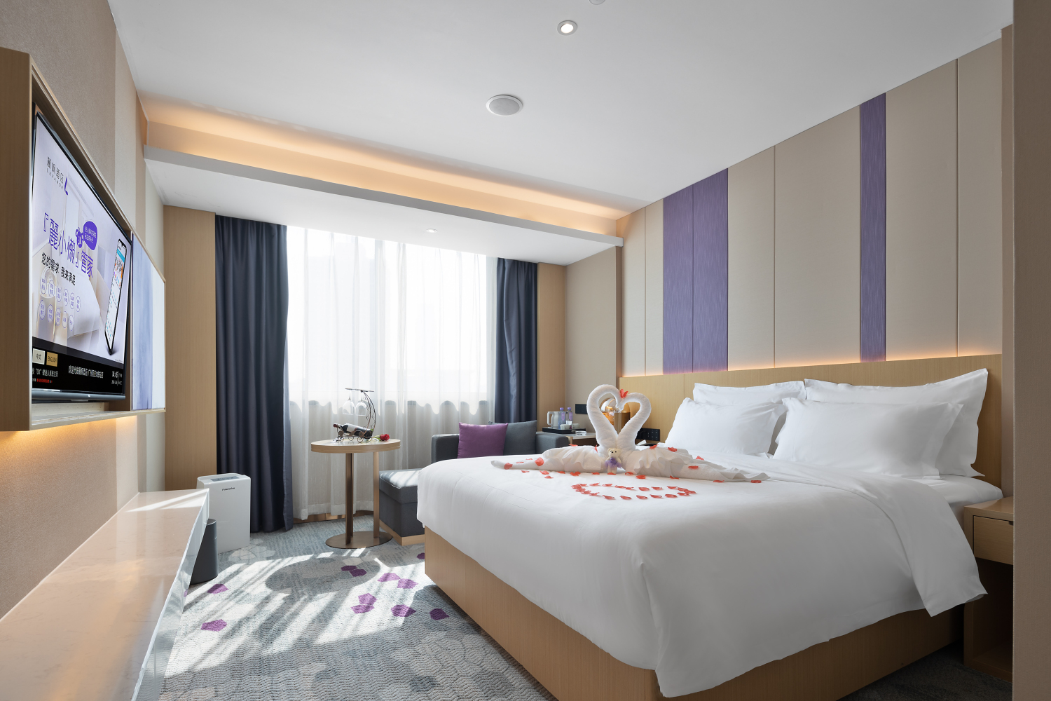 酒店拥有一百余间豪华客房,配置慕思床垫、新风系统、高星布草、品牌定制香氛洗护用品、空气净化器、智能控制系统、蓝牙音乐、43寸智能电视及百兆极速WIFI等一流硬件,致力于为您打造贴心舒适、亲近自然的商旅住宿空间。