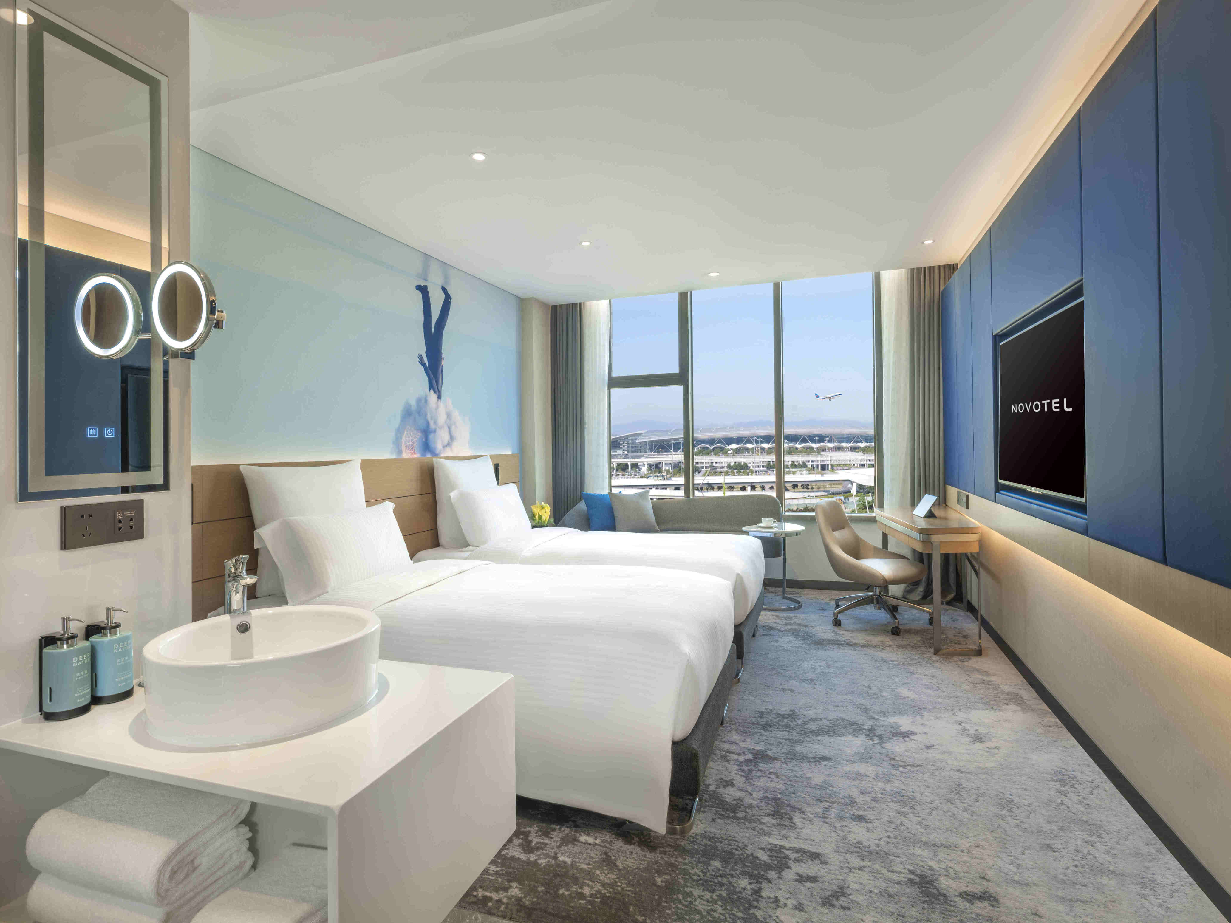 广州白云机场诺富特酒店坐落于广州白云国际机场的中心位置,与T2客运大楼仅一路之隔,车程仅需3分钟,出门即达,直达T3客运大楼的酒店穿梭巴士每20分钟循环往复,高效便捷助您轻松出行。酒店拥有268间舒适的客房及一个餐厅和大堂吧。客房内配有沙发床和小童设施,全景落地玻璃带来明媚的自然光线,云卷云舒,飞机起落,尽映眼帘,独特的餐饮体验和焕发活力的健身中心触手可及,无论是商务出行还是家庭亲子下榻,这里是您的理想之选。