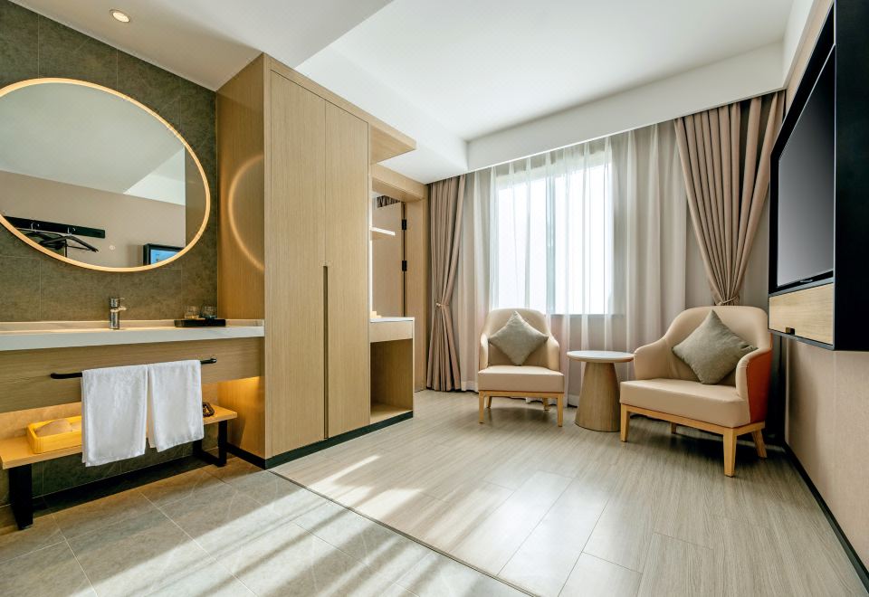 The hotel offers a range of room types, including Superior King Rooms, Twin Rooms, and Family Rooms. The rooms are spacious (20-35㎡) and equipped with en-suite bathrooms, high-speed Wi-Fi, HD TVs, and Simmons mattresses. Some rooms also feature a dedicated work area.
