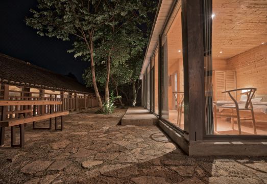 融安云止民宿交通便捷,紧邻209国道,距高速公路仅有10公里路程。村庄后山具有喀斯特地貌典型的“雄、奇、秀、幽”的特色,适宜进行民宿旅游开发。六寮村现存古村落已有数百年历史,属于平地形汉族民居村落。 传统房屋的室外改造我们在保留老宅外观的基础上进行修缮,以“修旧如旧”、“做旧如旧”为原则,坚决避免“修旧如新”,并将一些层高不足的低矮棚屋取消隔层或进行抬高处理;室外改造中最重要的部分是水电线路、排污管道、化粪池等的重新铺设,这也是老宅现状中最薄弱的部分,为达到美观实用的目的需要重新设计及铺装;采用有纹理天然石块削成台阶、取带有苔藓痕迹未经斧凿的石块砌成围墙,种一些野花草在石阶缝隙内,融入六寮本地的石匠文化,大量采用当地石材、花草,对宅与宅之间的空间进行有规划的梳理;餐厅等公共区域部分选择新建,采用更为低调的建筑语汇,以变截面钢结构和玻璃门窗系统与石材外墙、炭化木格栅、和屋面陶土瓦形成一种材料对比,新老建筑形成空间对话,让老宅变成公共区域的外景。 室内方面我们侧重于思考现代人的生活方式与原生态空间的对话,空间本身与光影的对话,室内与室外空间的互动。改造部分可保留原建筑木结构、黄土墙、坡顶。原旧木窗换为现代玻璃门窗,改善隔音及隔热。室内空间在满足空调等功能需求的前提下,尽可能的提升层高,与建筑呼应,让空间明快、简洁、流畅。室内改造材料采用老木头、素面水泥、石头、钢结构等,力求遵循朴实、自然、简单的原则。这些现代材料与原始的土坯墙形成了一种对比,但都有着一种厚重感,整体上有着相似的历史感。酒店目前只接受预约服务。