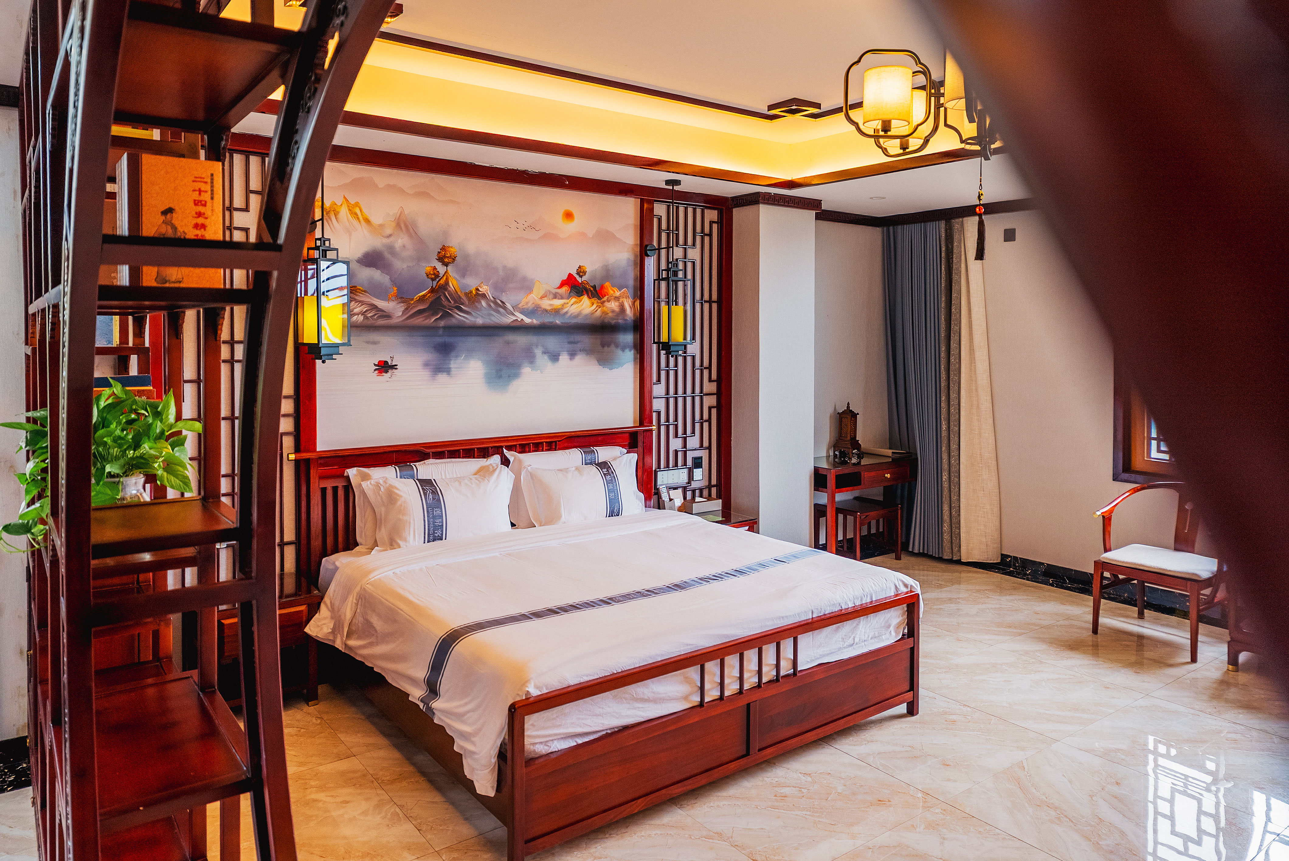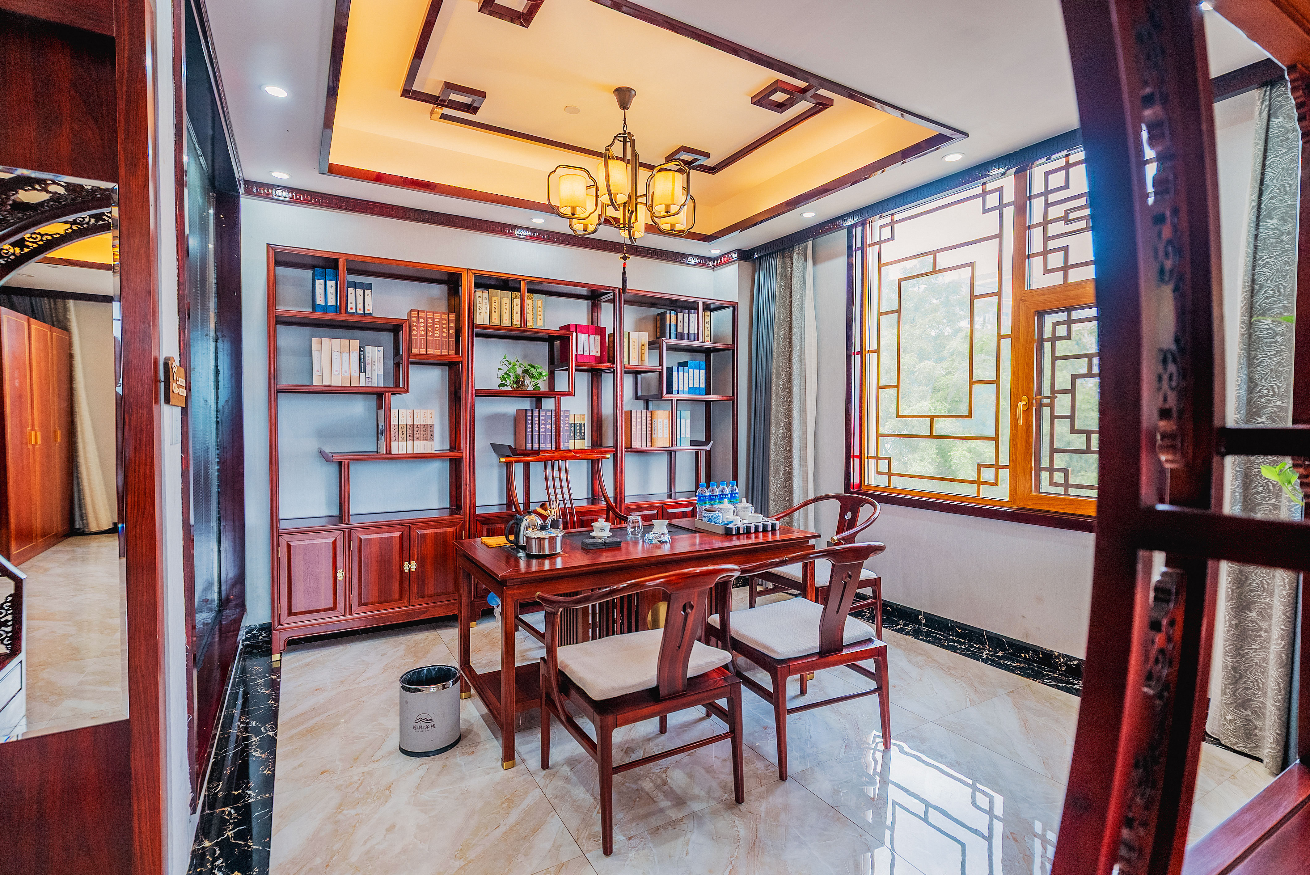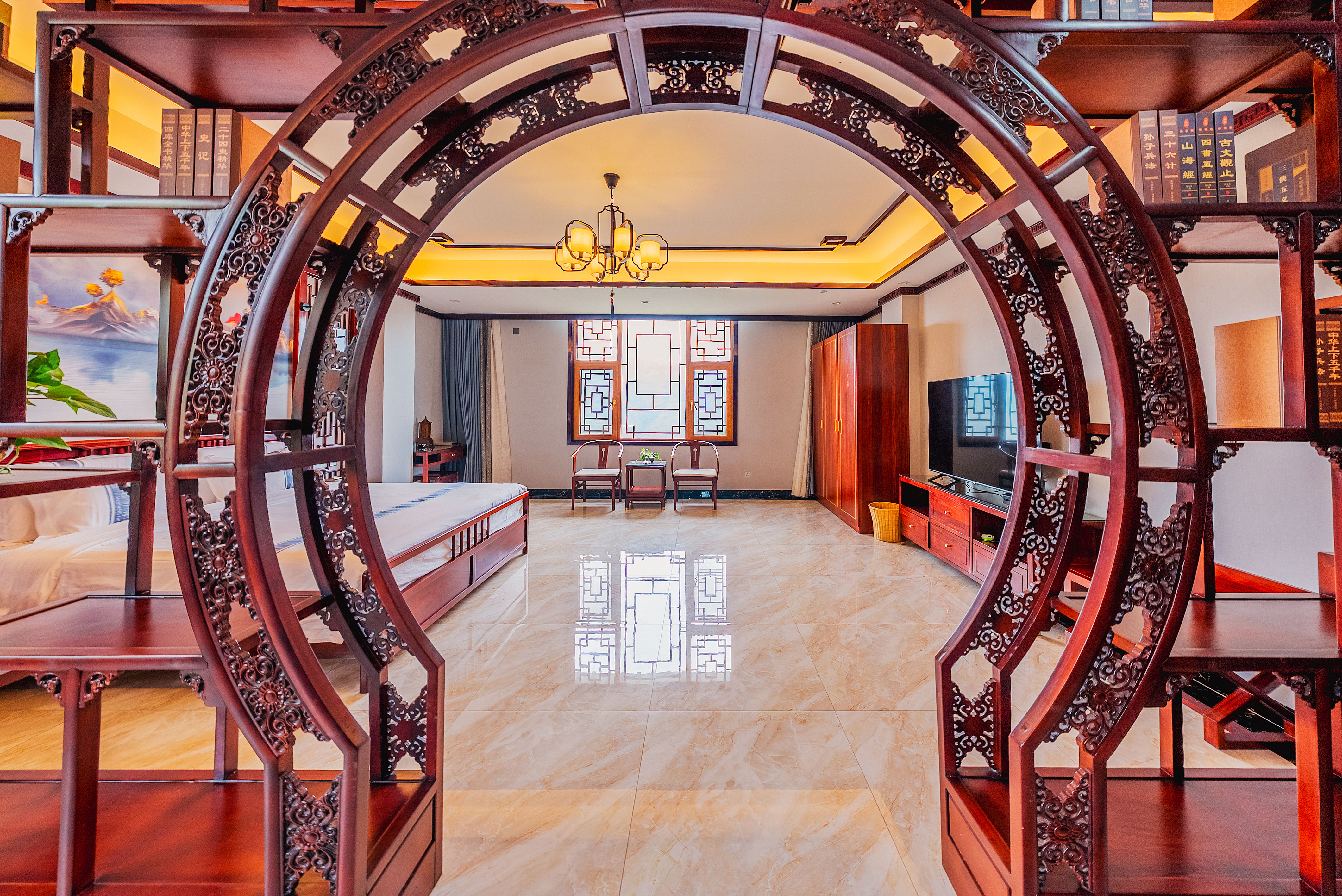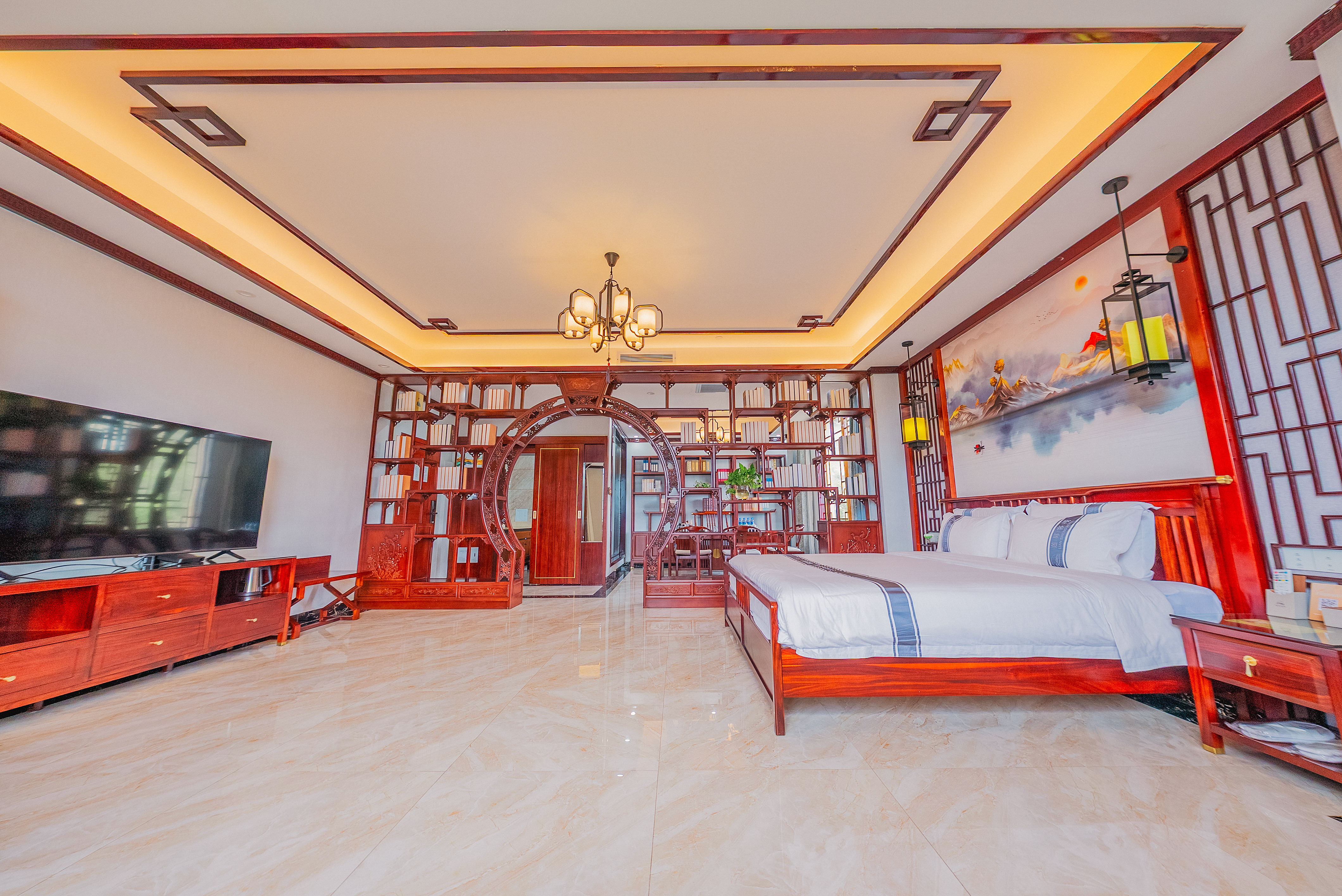 行政套房(山景+功夫茶台+智能小欧+智能马桶+新中式隔断月洞门博古架+会客分区)