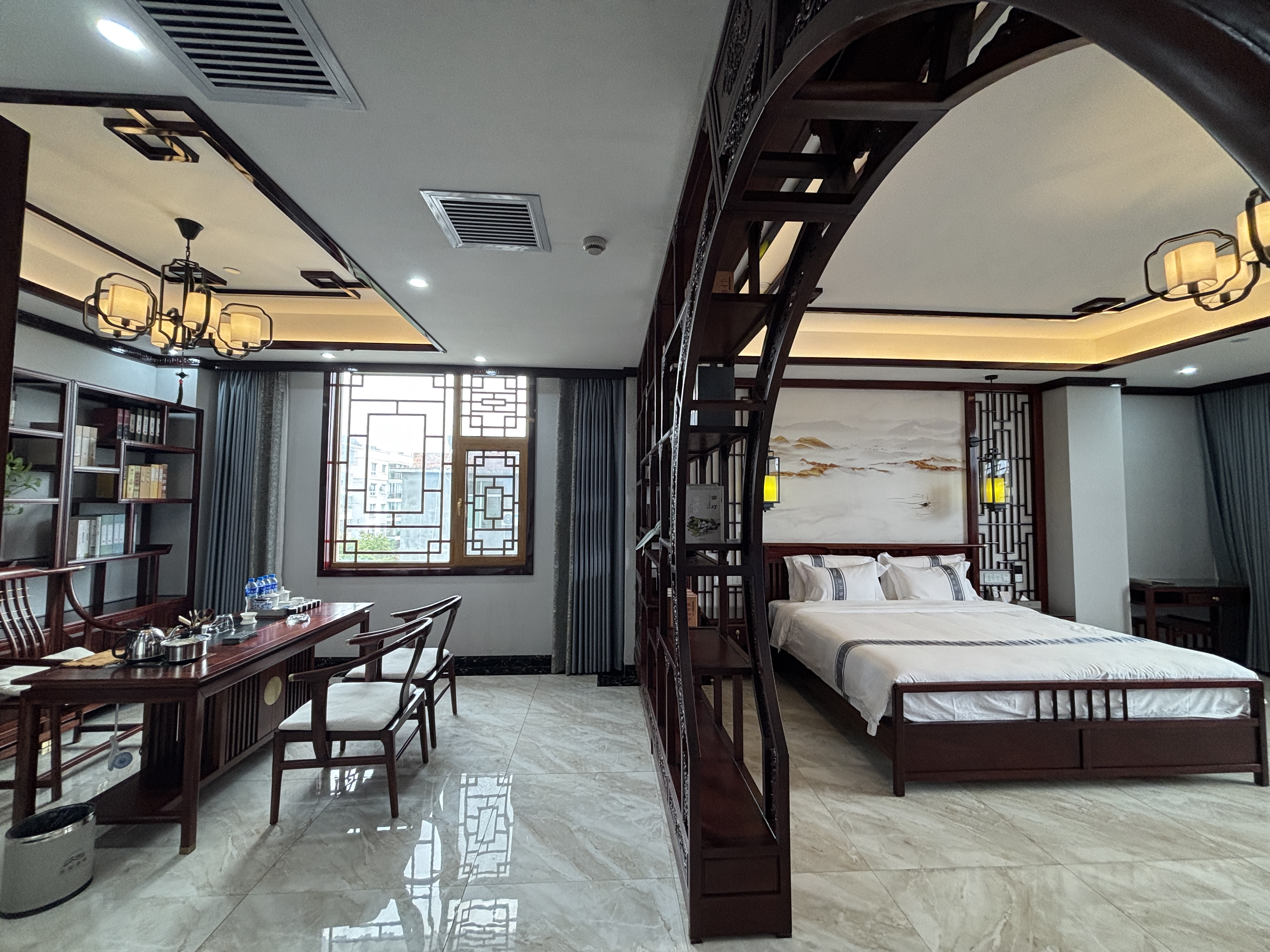行政套房(山景+功夫茶台+智能小欧+智能马桶+新中式隔断月洞门博古架+会客分区)