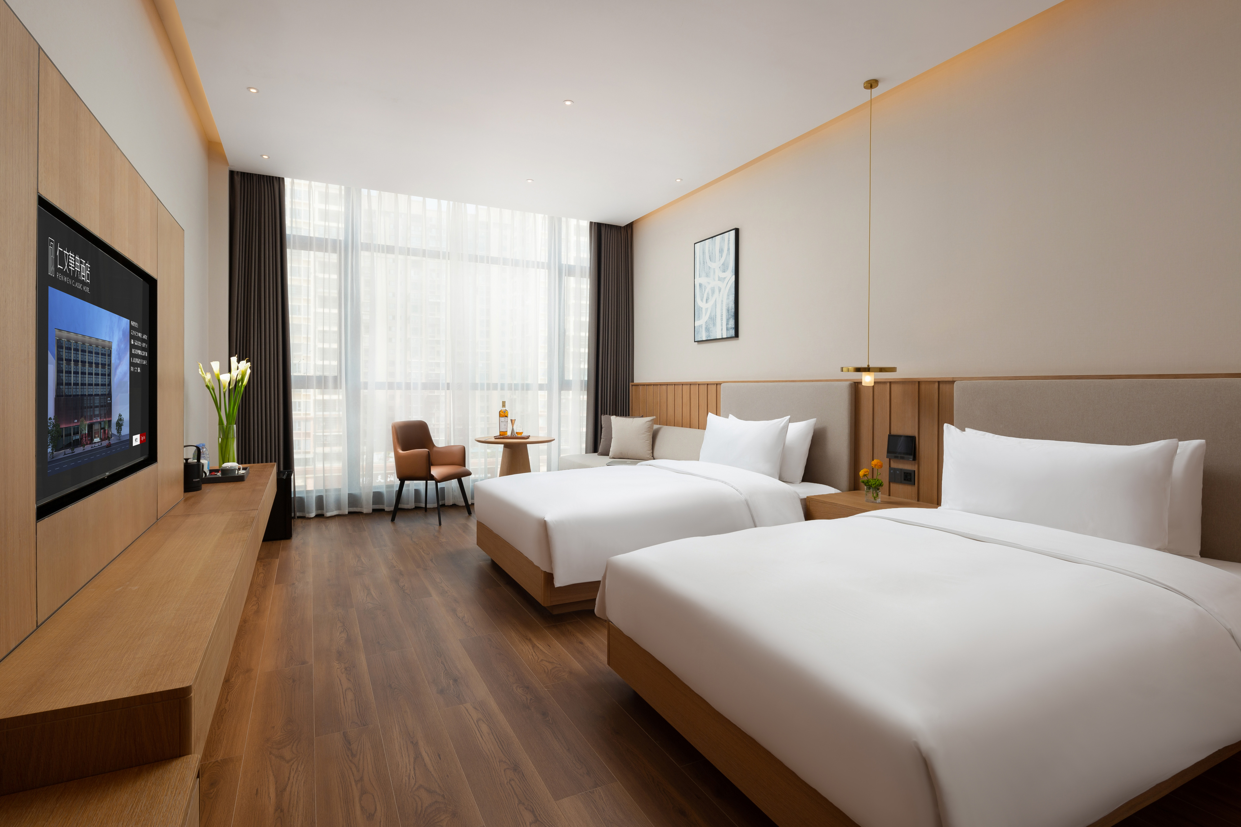 Renwen Huadian Hotel originates from the Analects of Confucius Yan Yuan: Fan Chi asks Ren. Confucius said: love. Therefore, the whole hotel takes traditional Chinese benevolence as the soul of culture, creates a cultural and Art Hotel with oriental aesthetics, and places the spirit of Renwen China in the center of Renshou city and inherits it from generation to generation.The hotel is located at JIANAN Road, Renshou County. Renwen Huadian Hotel has built three high-end wedding banquet centers with an area of 3000 square meters as a whole, undertaking various theme weddings, birthday banquets, group construction and other large-scale celebration centers. The 1760 square meter Chinese Zen tea house and 16 private tea rooms vividly deduce the Chinese tea ceremony culture of Zen tea. 122 new Chinese cultural theme rooms, including 48 new Chinese cultural standard rooms, 51 Zen King rooms, 18 Guofeng Renwen suites and 5 benevolent parent-child suites, so as to express China's national style and Renwen into each space."Benevolence, national style, Chinese Tongdian". Renwen Huadian Hotel is looking forward to your visit.