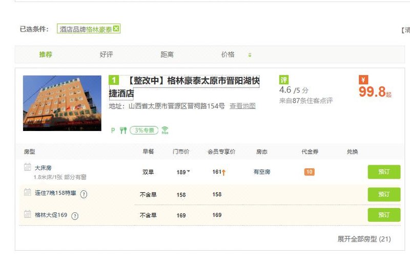 格林豪泰(太原市晉源區晉祠路一電廠快捷酒店)預訂電話:+8620-86009099