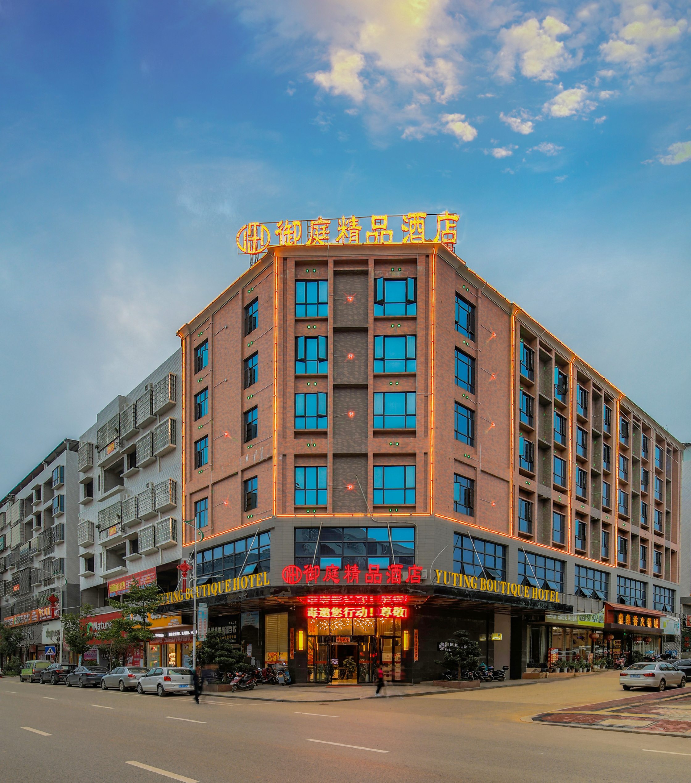御庭精品酒店简介新田御庭酒店,让精品不再遥远!新田县位于湖南省南部,永州东南部,新田人杰地灵、人文蔚起。几百年来,勤劳、朴实、勇敢的新田人民在这片土地上创造了可歌可泣的辉煌业绩。新田人敢为人先、战天斗地,曾搏得一代伟人毛泽东“南有新田”的美誉。御庭精品酒店地处新田县新城区云鹤路,周边商业配套完善,交通便利。御庭精品酒店秉持“精致不粗、高雅不俗、舒适不累”的设计理念,将现代商务融为一体,以高雅温馨却不失简约内敛的设计风格将人文与现代气息完美融和。精心打造近70套精品客房,酒店选用东宝床垫、决明子枕芯、九孔纯棉被、品牌卫浴、定制个性电视、免费无线网络等,宾客可享受到一系列尊贵服务。御庭精品立足打造新田性价比第一酒店,我们提倡“管家式”的周到服务,一切心您的体验为前提,让安全舒适、温馨体贴、专业细致的服务带给您亲人般的享受,家人般的温暖。我们最大限度地调动员工主观能动性,始终坚持“宾客至上、服务第一”的服务宗旨。御庭精品酒店倡导“以人为本”的管理模式,引进全新管理服务理念,由资深酒店管理团队管理,拥有一支敬业精神强、专业素质高的员工队伍,以“成就至尊服务,打造行业品牌”为酒店不懈努力的目标。使之在永州地区乃至湖南成为有口皆碑的品牌酒店。“零押金入住、零停留退房”是新田御庭精品酒店针对铂金会员及大客户的礼遇政策。每次入住,您都可以享受无押金入住,开始享受完全由您作主的时光。而当您结束旅途退房的时候,你可直接将房卡交放到前台便可,无需查房,亦无需到前台办理退房手续。除此之处我们还有更多非凡的会员优惠等等您的体验。走近御庭精品酒店一直到退房那一刻起,让您一次驻足、一生眷恋!