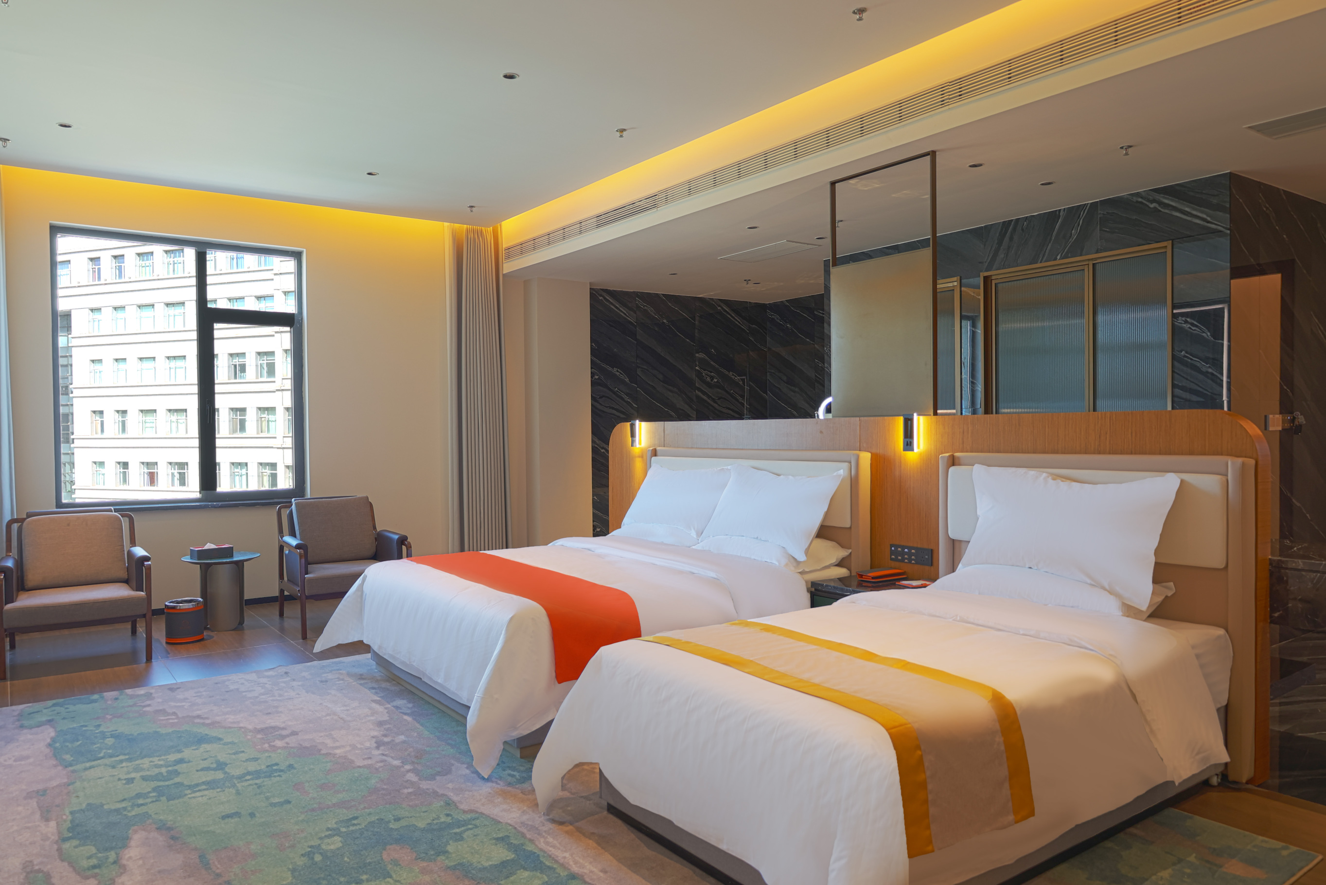 星光华远酒店(鄂尔多斯市政府店)坐落于鄂尔多斯市康巴什新区核心地带,紧邻市政府行政中心,是一家集商务、休闲、会议于一体的现代化高端酒店。酒店秉承"星光璀璨,华远相伴"的服务理念,为宾客提供温馨舒适的入住体验。酒店拥有各类豪华客房及套房,配备先进的客房设施:舒适睡眠系统:高品质床垫和床上用品,保证优质睡眠;智能控制系统:智能灯光、空调、电视一体化控制;高速网络:全酒店覆盖免费高速WiFi和有线网络;豪华卫浴:国际品牌卫浴设施,24小时热水供应;餐饮服务:中餐厅:主营正宗蒙古族风味菜和粤菜,可容纳200人同时用餐;提供国际自助早餐和西式零点菜品;送餐服务:满足宾客随时随地的用餐需求。会议与宴会:多功能会议厅:配备先进的音响、投影设备,可容纳10-300人;宴会厅:豪华装修,可承办各类婚宴、商务宴请;商务中心:提供打印、复印、传真等商务服务。休闲娱乐设施,健身房:配备专业健身器材,24小时开放。