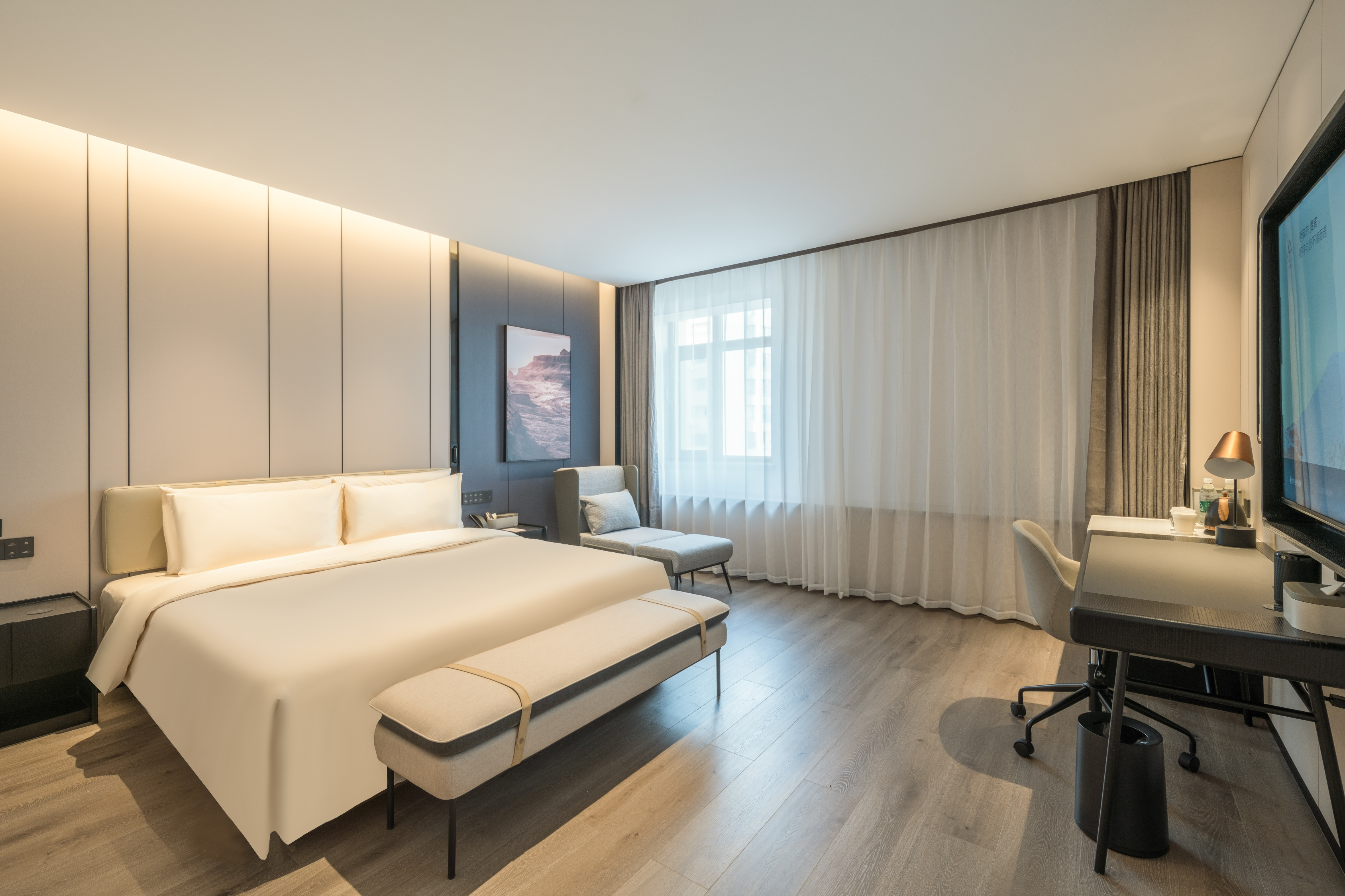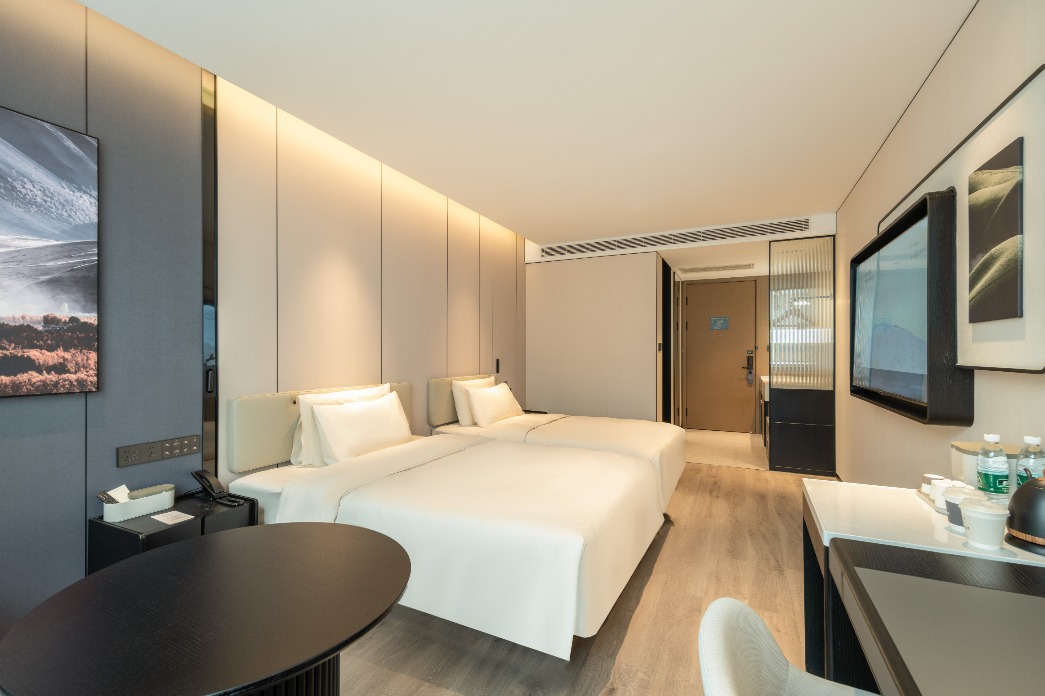全部房间实现智能----电动窗帘、智能马桶、无线充电、智能客控系统等。酒店设施齐全,自助洗衣机、健身房、多功能会议室、自助早餐、休闲竹居(书吧),满足不同客人的需求。酒店以现代温馨的装修风格,体贴周到的服务,智能化现代化的设备,给人们带来便利的同时,也能感受到家的温暖。