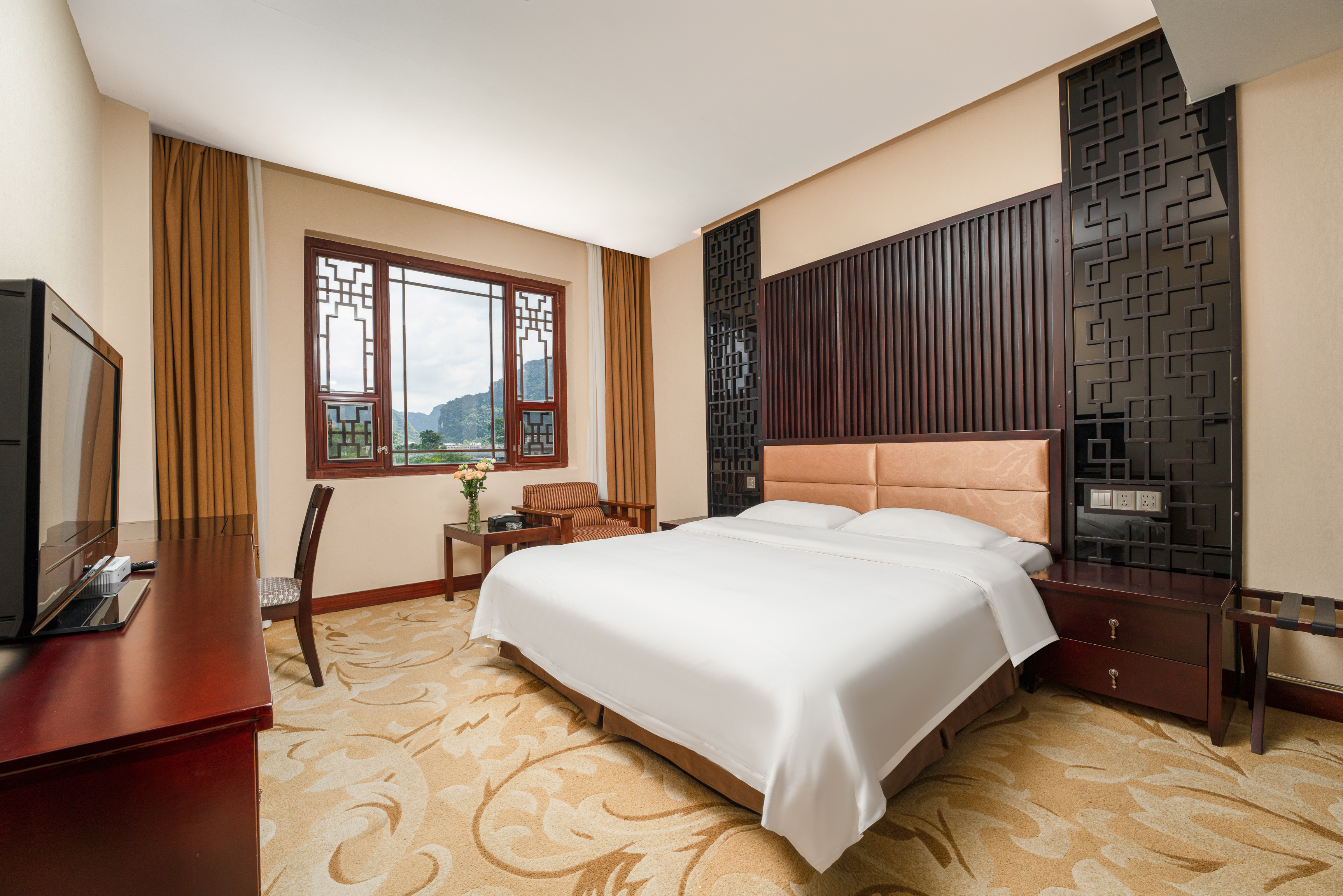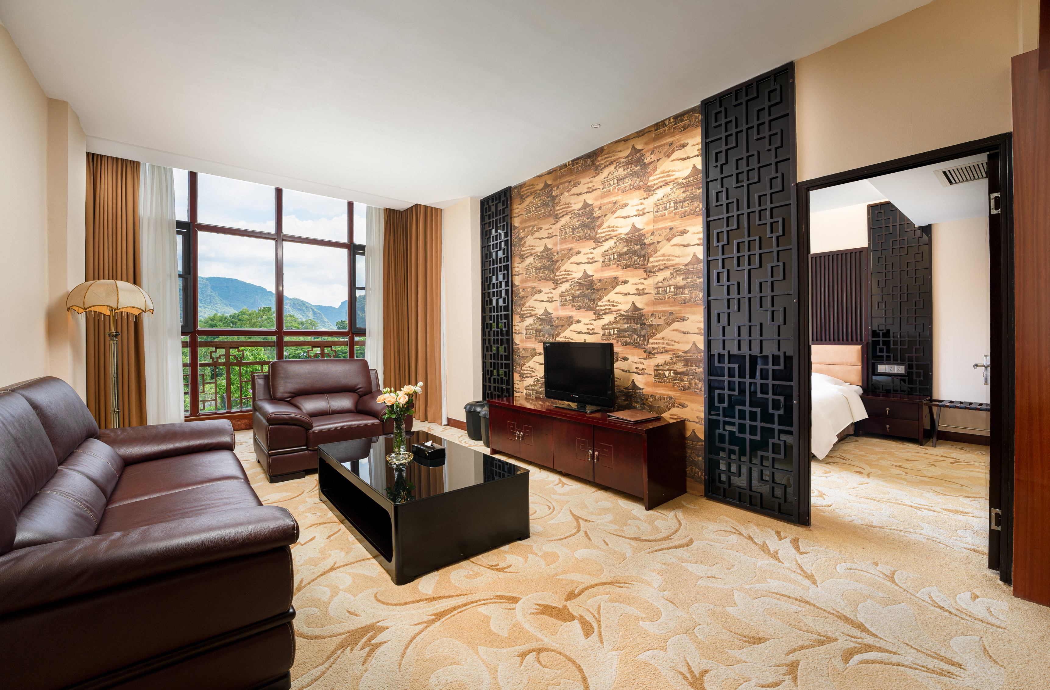 黄姚酒壶山宾馆位于黄姚古镇景区综合服务区内,坐北向南,背靠景区内的“酒壶山”,左前方是真武山,右前方是隔江山,宾馆正门前便是钱兴广场和黄姚美丽的母亲河“姚江”,宾馆距桂梧高速公路路口 约1 公里,距古镇景区入口约200米。这是一座具有岭南风格特色的综合性宾馆,总体典雅大方、古色古香、明清庭院设计、小桥流水、木制凉亭、仿木坐椅、回形走廊,360度尽享中式古典园林景观,青砖墙体,屋面黛瓦铺盖致密,实木镂空镶嵌,红色主调的长廊走道,透露着黄姚千年古镇风韵与气息,是现代艺术与古典美学的完美融合。宾馆建筑面积11000m2,占地面积7000多m2,楼体三层,为分体互通建筑,整体呈“四合院”风格。宾馆设备设施先进,通讯快捷,网络尽情享受,拥有多种房型客房百余间(套),中、西餐厅、豪华包间、咖啡厅和多功能大小会议室等配套服务设施齐全。宾馆附设商务中心、大型停车场、物品寄存、24小时安保服务等。