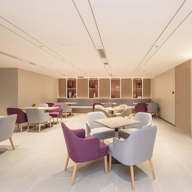 空间设计上,以低饱和紫调碰撞温润木质,勾勒简约雅致的美学氛围,分段式接待台搭配半围合多功能空间,让通透与柔和贯穿整个公区,细节处尽显精致。全域萦绕标志性薰衣草淡香,订制香氛系列薰衣草洗护套装、音乐花洒、助眠背景音乐层层营造松弛感,雅兰订制床垫、高品质纯棉床品更让深度睡眠触手可及。