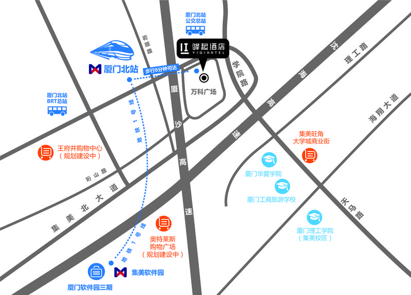 驿起酒店(厦门北站店)地址:福建 · 厦门 · 集美区 · 厦门北站旁万科广场商业街内2-6楼
