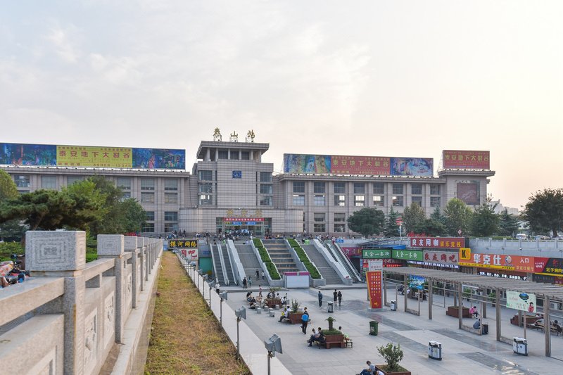 东岳大街银座城市广场距火车站直线距离300米,打车到泰山景区六块钱,楼下有美食街、电影院、KTV、麦当劳、肯德基、必胜客一应俱全,是您旅游的理想住处!