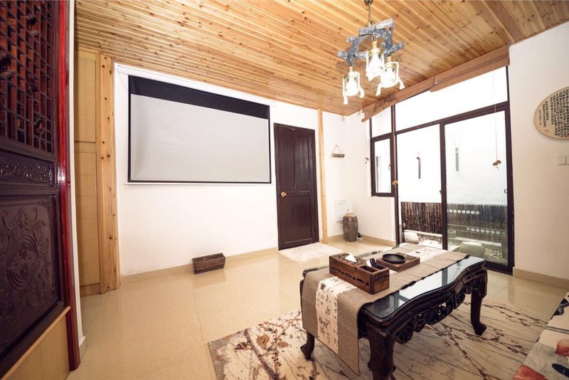 客厅:配备了高档茶具和龙井茶,100寸投影可以收看有线电视和网络电视,并有挂烫机配备,网络是100兆带宽